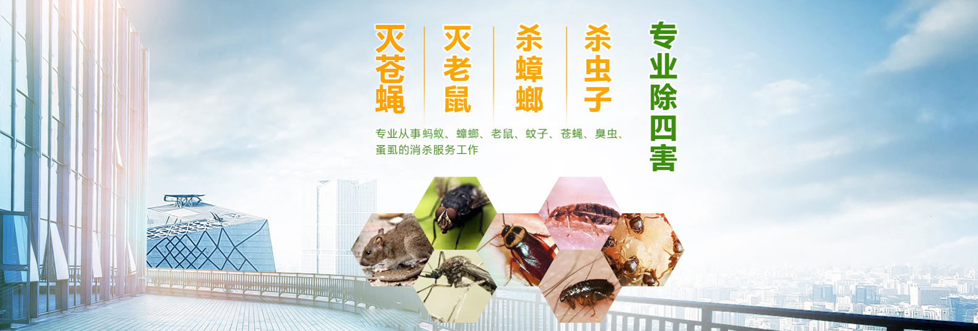服務(wù)于為賓館飯店、餐飲業(yè)、食品加工業(yè)、建筑業(yè)、商場、超市、學校、工廠、醫(yī)院等單位和家庭提供鼠蟲害等有害生物防治。